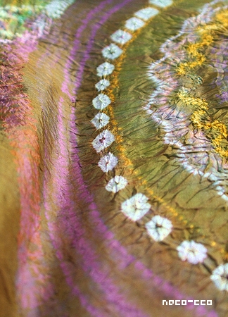 flower Power ** ●技法(Technique) : 注染 (Chusen) ●制作 : 2007.9 卒業制作に入る前、あたたかくて気持ちの良い気候にうかれて自主制作で染めた布。 ピンクとイエローは私のハッピーカラー。 課題では使わない色の組み合わせだから、自主制作で思いきって制作しました。 やっぱり自分の好きな色だと作ってても楽しい! 当たり前だけど、やっぱり楽しんでやることって大事なこと。 学校で干していたらたまたま見てた先生にも、『あなたらしい色ね!』と言われて 好きな色が自分らしいと言ってもらえることってすごくうれしい!と思いました。 注染って?と思う方はつづきで簡単に説明するのでどうぞ◎